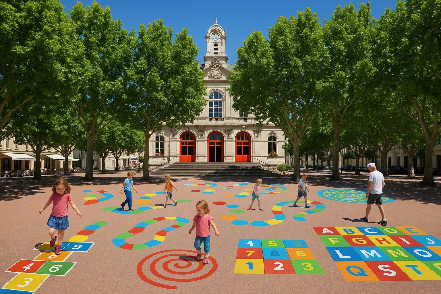 Pour rendre cet espace plus attractif, sécurisé et stimulant pour les plus jeunes, je vous propose d’aménager la place avec des jeux au sol ludiques et colorés : marelles, parcours de motricité, jeux de lettres et chiffres, labyrinthes peints au sol, etc. Ces aménagements égayeront la place tout en offrant des activités éducatives et récréatives accessibles à tous.